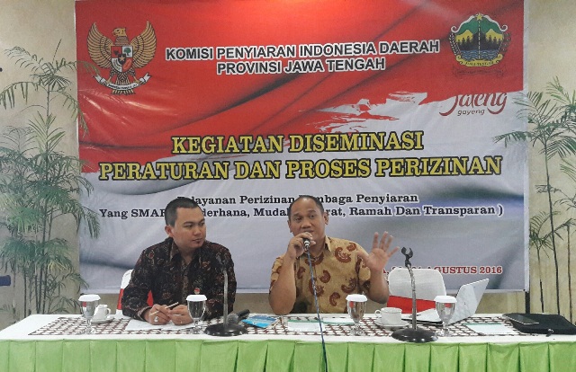 Sukoharjo - Komisioner KPID Provinsi Jawa Tengah, Asep Cuwantoro menekankan pentingnya negara hadir dalam layanan perizinan lembaga penyiaran. Hal tersebut sejalan dengan amanat Undang-undang nomor 32 tahun 2002 tentang Penyiaran bahwa peran dan fungsi KPI salah satunya adalah membantu pemerintah dalam menata infrastruktur penyiaran. Pernyataan tersebut disampaikannya dalam acara Diseminasi Peraturan Perizinan Lembaga Penyiaran yang diselenggarakan oleh KPID Provinsi Jawa Tengah di Hotel Ommaya Sukoharjo.