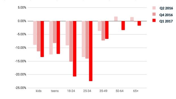 Dalam 12 bulan terakhir, penonton usia 18 sampai 35 tahun telah memangkas jam menonton siaran bulanan mereka lebih dari 20%. Mereka beralih lebih cepat dari tahun sebelumnya, pada Q4 2016, hanya terjadi penurunan sebesar 15%, sementara pada Q2 2016 mendekati 10%.
