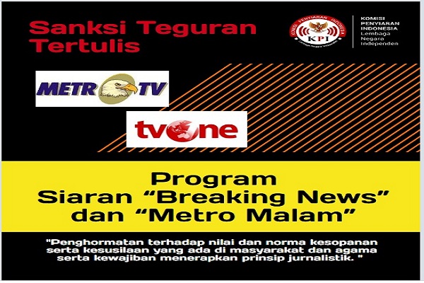 Jakarta -- Komisi Penyiaran Indonesia (KPI) memutuskan menjatuhkan sanksi teguran tertulis untuk program siaran jurnalistik “Breaking News” di TVOne dan program siaran jurnalistik “Metro Malam” di Metro TV. Kedua program siaran ini kedapatan menayangkan tayangan yang melanggar aturan Pedoman Perilaku Penyiaran dan Standar Program Siaran (P3SPS) KPI tahun 2012.