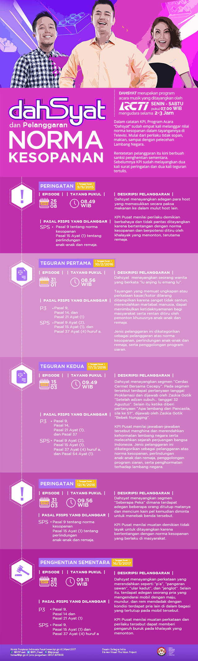 Dalam kesempatan itu, KPI Pusat menjelaskan jika peringatan ini merupakan bagian dari pengawasan KPI Pusat terhadap pelaksanaan peraturan serta P3 dan SPS oleh lembaga penyiaran sesuai dengan amanat dalam Undang-Undang No. 32 Tahun 2002 tentang Penyiaran (UU Penyiaran). ***