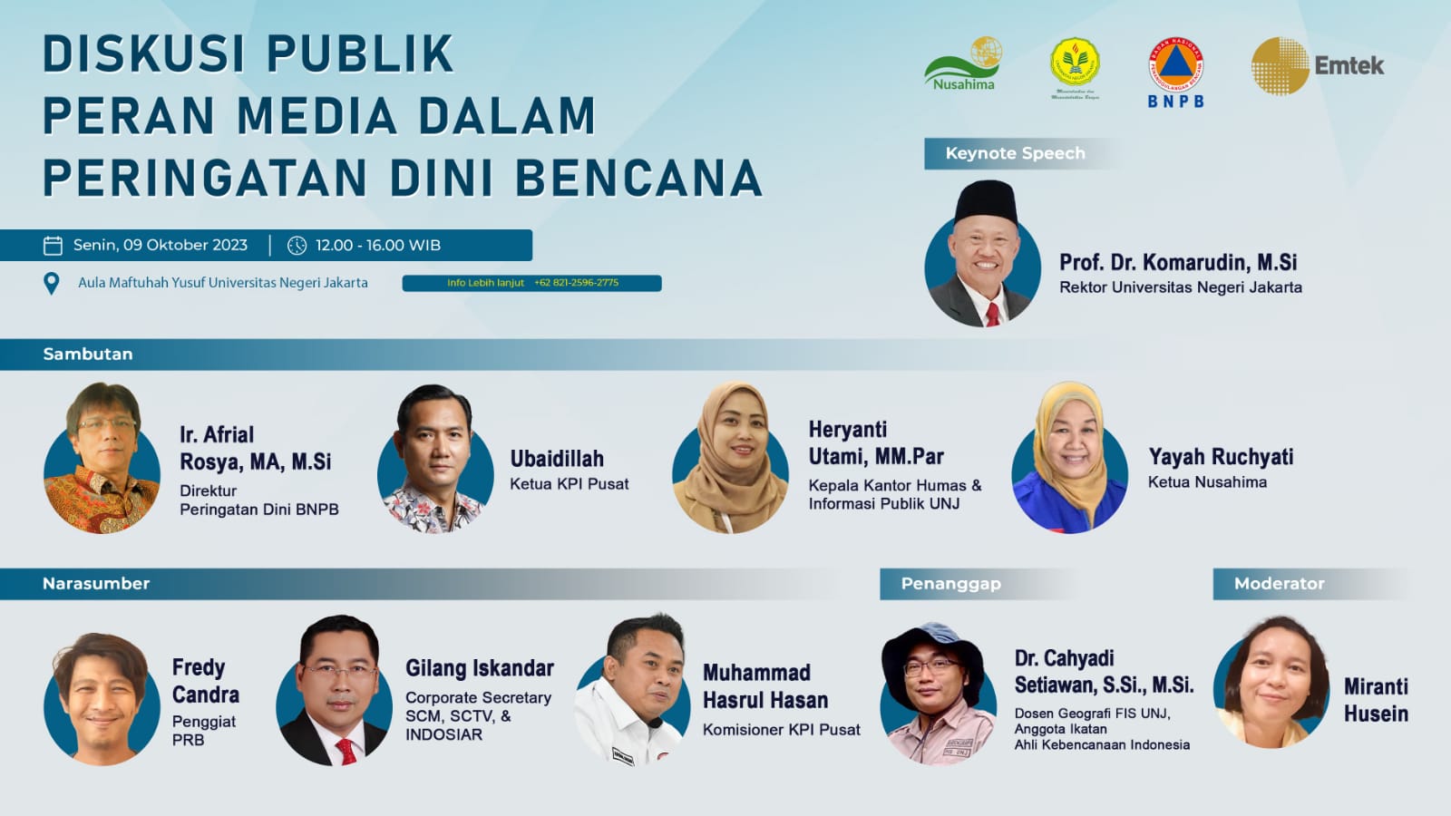Diskusi yang digelar dalam peringatan Bulan Pengurangan Risiko Bencana bekerja sama dengan Yayasan Nusahima. Turut hadir Rektor UNJ Komaruddin, Direktur Peringatan Dini Badan Nasional Penanggulangan Bencana (BNPB) Afrial Rosya, dan Corporate Secretary SCM Gilang Iskandar. Sebagai perwakilan dari lembaga penyiaran, Gilang Iskandar menyampaikan, media baik broadcast dan online hanya bertugas menyampaikan informasi peringatan dini yang diterima dari lembaga yang berwenang seperti BMKG. Sebelum menyiarkan, media memiliki mekanisme kontrol dan seleksi untuk memastikan validitas dan akurasi setiap informasi terkait potensi bencana. “Meski pada praktiknya masih terdapat kebingungan, terkait leading sectornya,” ungkap Gilang.  Di satu sisi, tambahnya, media juga perlu mendapat pemahaman soal sistem penanggulangan bencana, kode etik peliputan bencana, serta safety and security saat melakukan liputan kebencanaan.