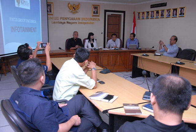 Jakarta – KPI Pusat kembali menyelenggarakan kegiatan Fokus Grup Diskusi (FGD) membahas soal infotainment, Kamis, 18 Juni 2015. Meskipun secara umum tayangan infotainment sudah mengalami perbaikan, FGD yang mengundang kalangan industri televisi, rumah-rumah produksi dan stakeholder tetap membahas hal-hal yang tidak boleh disiarkan dalam tayangan tersebut sesuai aturan P3SPS KPI.