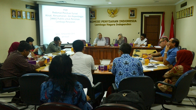 Jakarta – Komisi Penyiaran Indonesia (KPI) Pusat menyelenggarakan Fokus Grup Diskusi (FGD) mengenai Pedomanan Panduan Survei Minat, Kenyamanan dan Kepentingan Publik untuk Perizinan Lembaga Penyiaran di kantor KPI Pusat, Jakarta, Senin, 12 November 2014. FGD ini diselenggarakan khusus oleh bidang infrastruktur penyiaran dan perizinan KPI Pusat. FGD tersebut turut mengundang stakeholder terkait dan Anggota Komisi Penyiaran Indonesia Daerah (KPID).