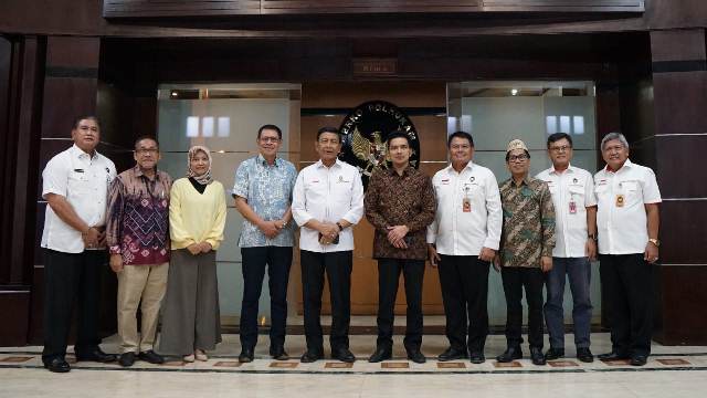 Ketua KPI Pusat, Agung Suprio, Wakil Ketua KPI Pusat, Mulyo Hadi Purnomo dan Komisioner KPI Pusat, Mohamad Reza, Mimah Susanti dan Aswar Hasan berfoto bersama Menkopolhukam Wiranto usai pertemuan di Kantor Kemenkopolhukam, Rabu (11/9/2019).
