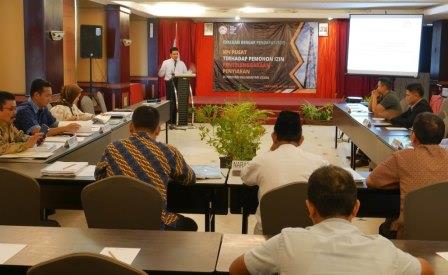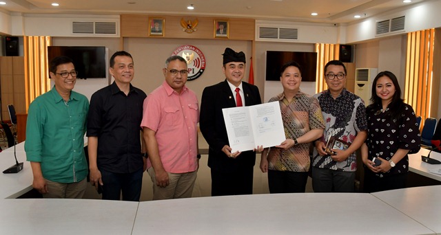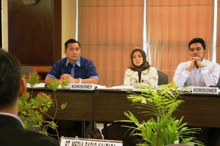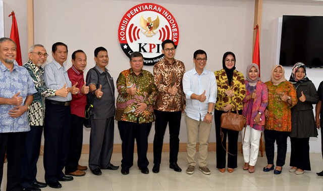 Komisioner Komisi Penyiaran Indonesia (KPI) Pusat berfoto bersana dengan anggota Dewan Perwakilan Daerah (DPD) Republik Indonesia asal Bali, Dr Shri I Gusti Ngurah Arya Wedhakarna Suyasa III dengan pihak SCTV usai media di Kantor KPI Pusat.