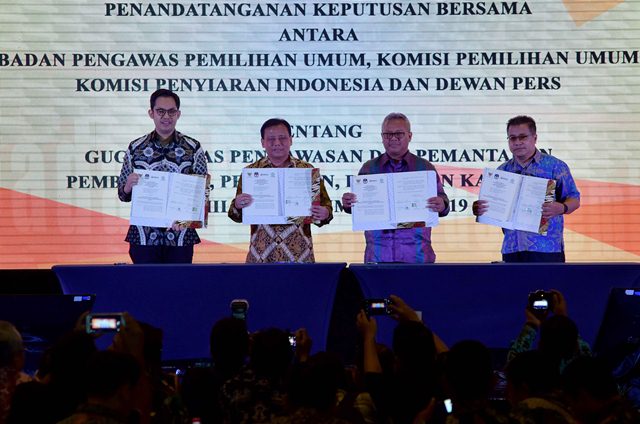 Pembentukan Gugus Tugas bersama Bawaslu, Komisi Pemilihan Umum (KPU), Komisi Penyiaran Indonesia (KPI) dan Dewan Pers yang ditandatangani Selasa (25/9/2018) pagi tadi di Hotel Bidakara, Jakarta Selatan.