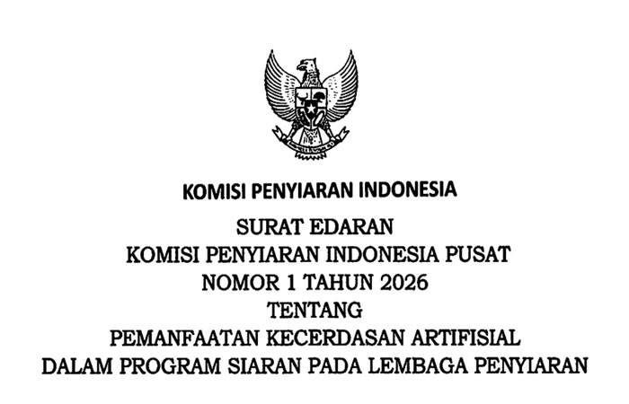 Jakarta -- Komisi Penyiaran Indonesia (KPI) menerbitkan Surat Edaran (SE) Nomor 1 Tahun 2026 tentang Pemanfaatan Kecerdasan Artifisial dalam Program Siaran pada Lembaga Penyiaran. Edaran ini sebagai pedoman bagi lembaga penyiaran agar tetap sesuai dengan ketentuan peraturan perundangan-undangan, etika penyiaran dan kepentingan publik di bidang penyiaran serta P3SPS (Pedoman Perilaku Penyiaran dan Standar Program Siaran) KPI tahun 2012.