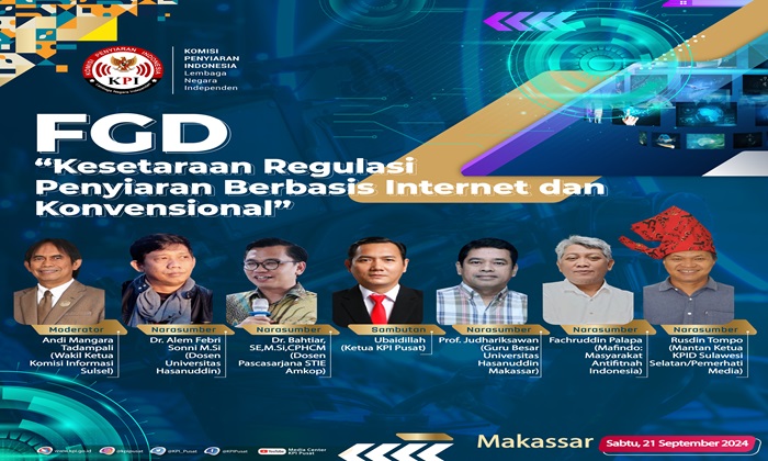Hadir sebagai narasumber dalam diskusi tersebut, Guru Besar Ilmu Hukum Universitas Hasanuddin, Prof. Dr. Judhariksawan, yang juga merupakan Ketua KPI Pusat periode 2013-2016. Narasumber lainnya, pemerhati media Rusdin Tompo, Akademisi dari Sekolah Tinggi Ilmu Ekonomi AMKOP Makassar Bachtiar, Aktivis Masyarakat Anti Fitnah dan Anti Hoax Indonesia (MAFINDO) Fachruddin, dan juga Doktor Ilmu Komunikasi dari Universitas Hasanuddin Alem Pebri Sonni.