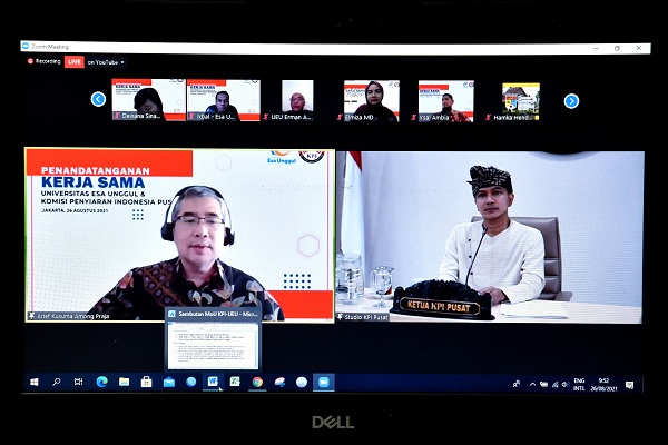 Jakarta -- Komisi Penyiaran Indonesia (KPI) dan Universitas Esa Unggul menandatangani perjanjian kerjasama atau MoU (memorandum of understanding) di bidang pendidikan, penelitian dan pengabdian, Kamis (26/8/2021). Kerjasama ini diharapkan memicu peningkatan kualitas dan pemberdayaan sumber daya manusia Indonesia menghadapi perkembangan teknologi utamanya di bidang penyiaran.