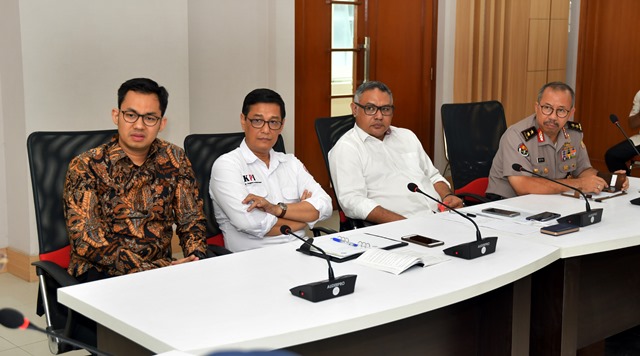 Ketua KPI Pusat, Yuliandre Darwis, Komisioner KPI Pusat, Mayong Suryo Laksono dan Hardly Stefano, serta Kadiv Humas Polri, Irjen Pol. Setyo Wasisto, saat acara diskusi tentang siaran langsung persidangan kasus terorisme di Kantor KPI Pusat, Senin (28/5/2018).