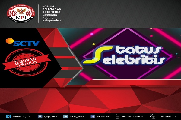 Jakarta -- Komisi Penyiaran Indonesia (KPI) memutuskan memberi sanksi administratif berupa teguran tertulis kepada program siaran “Status Selebritis” di SCTV. Program acara infotainmen ini kedapatan melanggar Pedoman Perilaku Penyiaran dan Standar Program Siaran (P3SPS) KPI tahun 2012. Pelanggaran ditemukan pada tayangan “Status Selebritis” tanggal 02 Februari 2021 pukul 07.25 WIB. Demikian ditegaskan KPI dalam surat teguran yang telah dilayangkan ke SCTV, 17 Februari 2021 lalu.